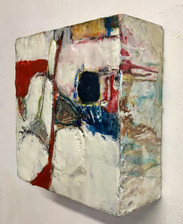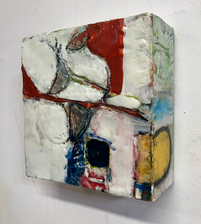 This piece, portal vision passage through, is a 3-D Encaustic painting that feels a bit like a sculpture. Three sides of the canvas box are also covered in encaustic and it hangs from 4 different ways, so there are 4 different perspectives.